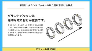 グランドパッキンはカット位置をズラして配置します。取り付け後は運転しながら一定量の漏れを確認しつつ、徐々に締め付け調整する必要があります。過剰な締め付けは摩耗や焼き付きの原因になります。